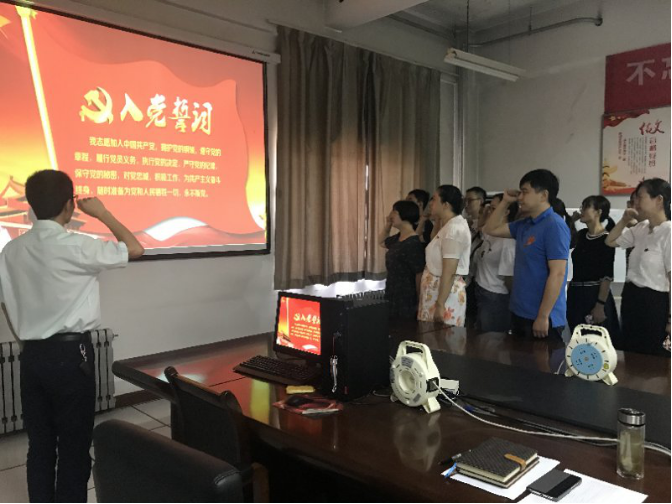 党委委员及办公室全体党员,举起右手,面向党旗庄严宣誓:“我志愿加入中国共产党,拥护党的纲领,遵守党的章程……”一句句铿锵有力的神圣誓言涤荡灵魂,大家的心灵再次受到震撼和洗礼。