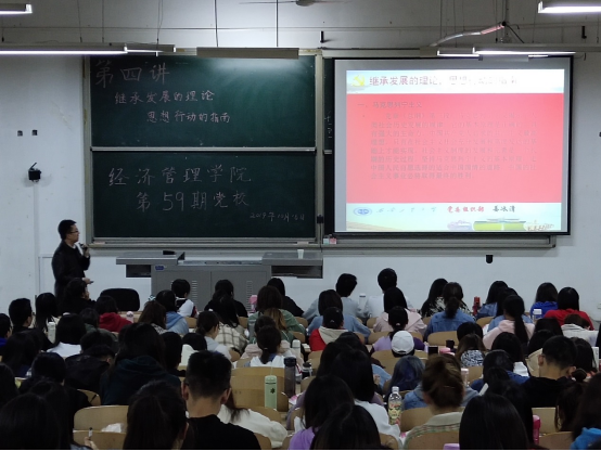 第五十九期党课培训第四讲“继承发展的理论,思想行动的指南”在教3-217教室顺利开讲,本次主讲老师校党委组织部副部长姜冰清老师为260余名党课学员进行指导及授课。
