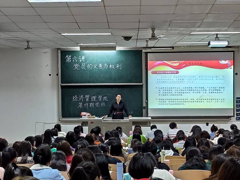课程伊始,苏兵老师结合社会现实和自身经历,向同学们讲述了她自己的入党动机以及入党前的思考,从而引出正确的入党动机应是“为实现共产主义而奋斗”和“全心全意为人民服务”,并让同学们思考作为一名合格党员的权利和义务。随后,苏兵老师着重讲述了党员的八项义务,并强调所谓党员义务,就是指一名党员对党应尽的责任,党员必须全心全意为人民服务,不惜牺牲个人的一切,为实现共产主义奋斗终身。作为一名共产党员,必须认真履行自己的义务。最后播放的纪录片,使同学们对党员的义务和权利有了更深刻的认识。