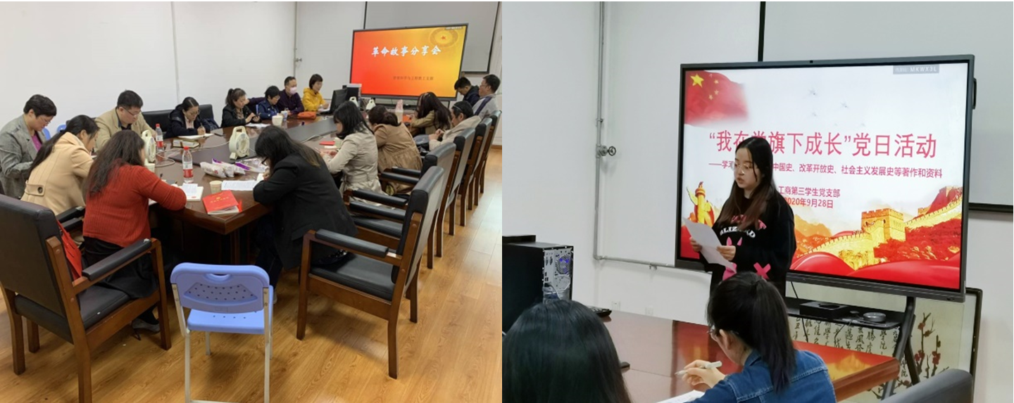 10月5日-10月12日,学院各党支部纷纷开展了“四史”学习教育主题党日活动。管科教师党支部开展“革命故事分享会”、工商第一学生党支部开展“阅读红色经典,传承红色精神”读书分享会,工商第三学生党支部开展“我在党旗下成长”主题党日活动,经济学生党支部开展“我是党代表”之“四史”学习教育主题党日活动,管科学生党支部开展“学史明志 坚守初心 勇担使命”主题党日活动等,各党支部通过党史知识学习、红色故事分享、红色经典感悟交流,进一步深化“四史”学习教育成效,不断增强听党话、跟党走的自觉。