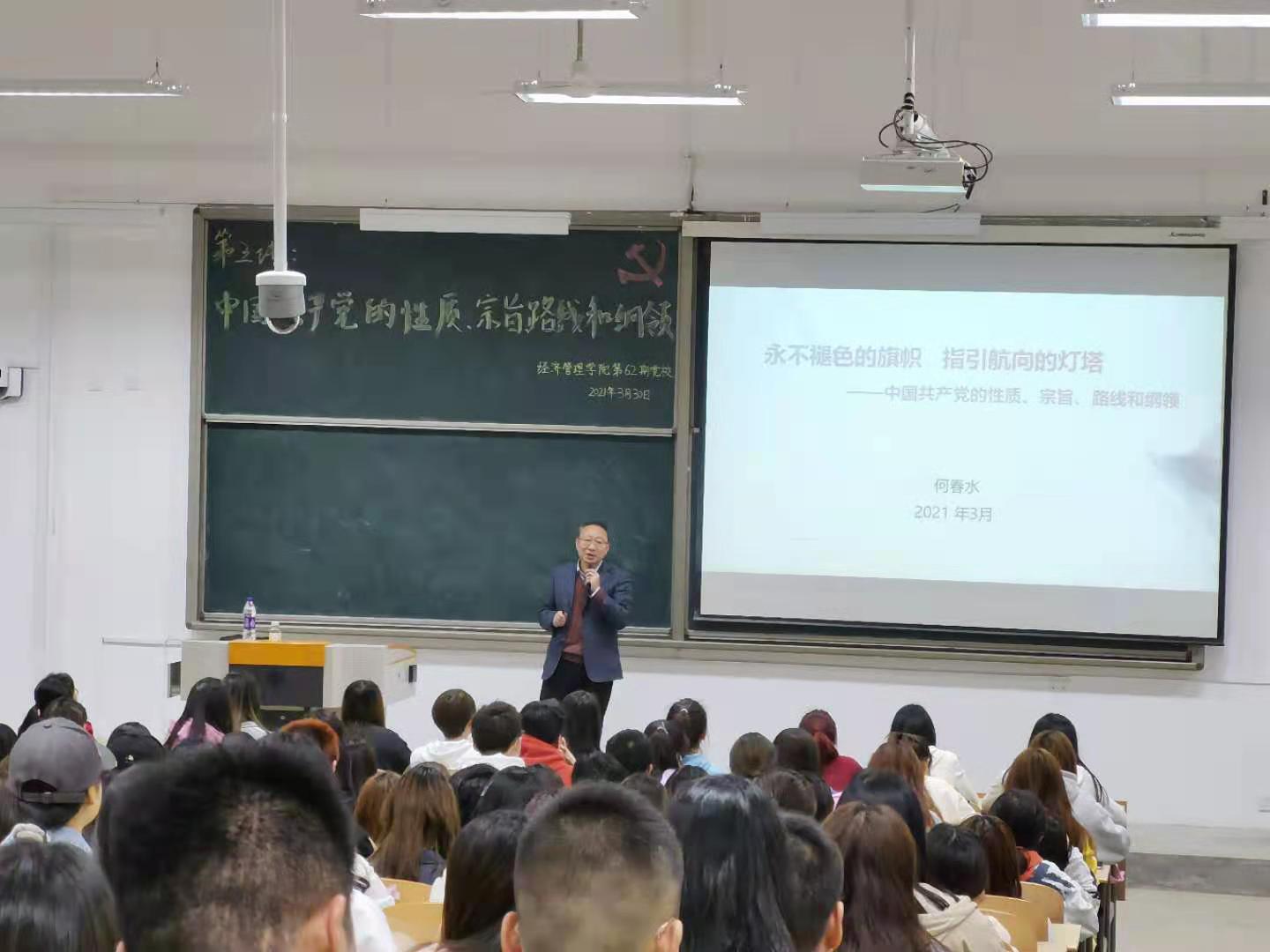 第62期分党校培训第三讲“中国共产党的性质、宗旨、路线及纲领”于教1-205教室顺利开讲,本次党课特邀请校纪委副书记何春水老师为260余名党课学员进行指导及授课。