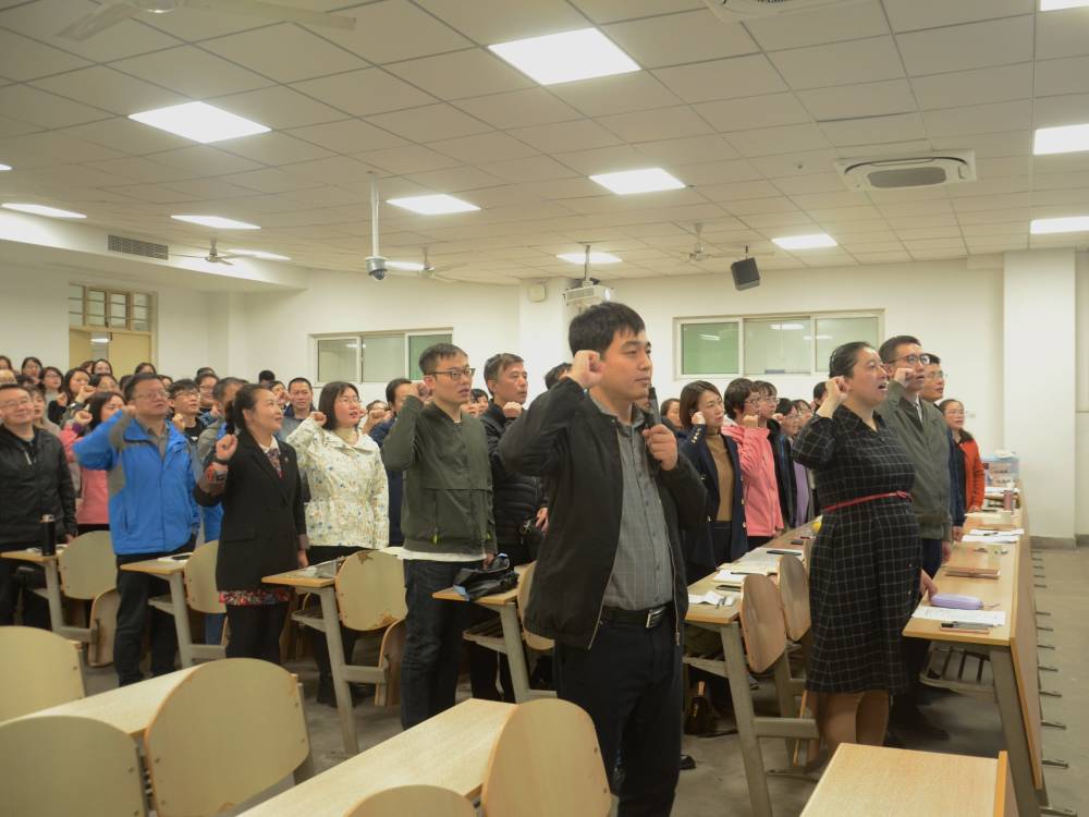 会议第一阶段,党委书记、副院长姬浩带领全院教师面对国旗,举起右手庄严宣读教师誓词。宣誓仪式后,全体教师签订了《西安工业大学教师承诺书》。