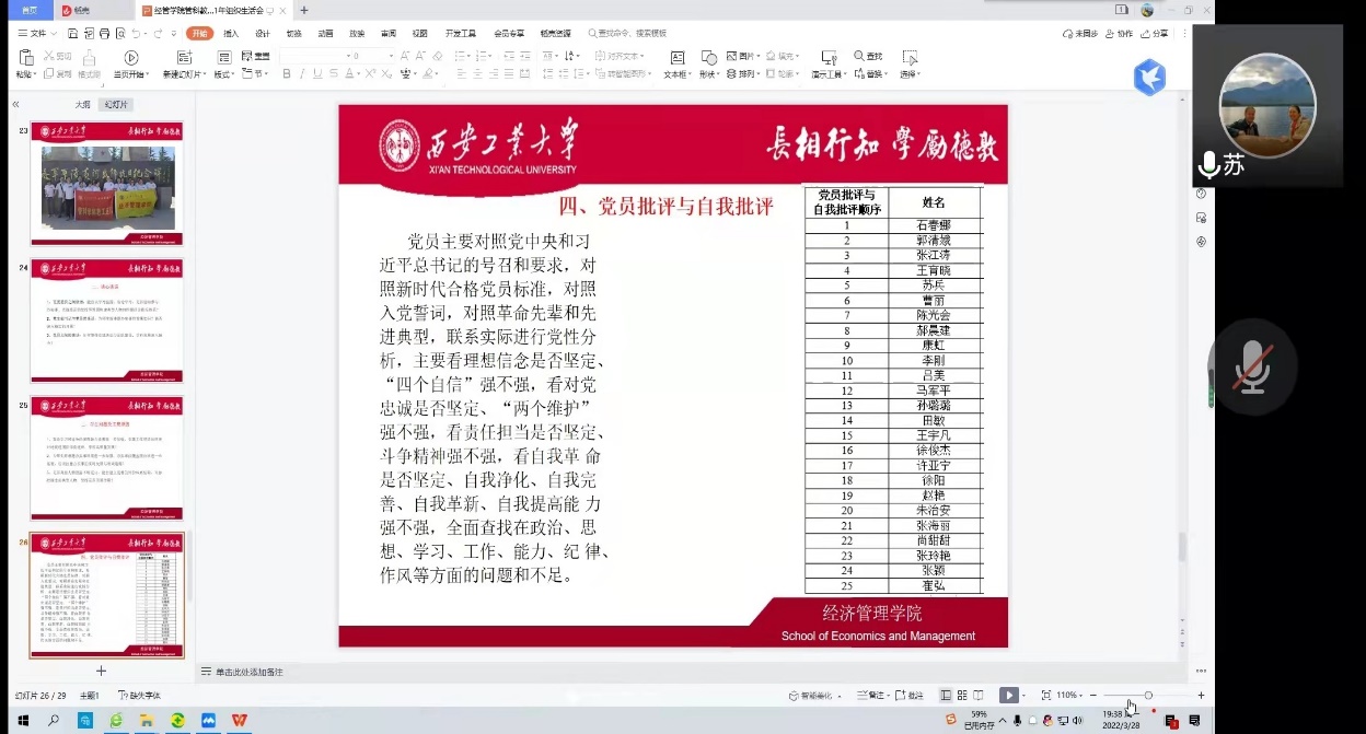 根据院党委统一安排,3月25日至30日,各党支部采取“线上+线下”的方式,扎实开展组织生活会暨党员民主评议。院党委委员按照联系支部情况参加了各支部会议,并对会议开展情况进行认真点评。