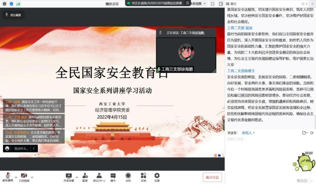 最后进行心得体会分享,其中工商第一学生党支部的赵晴积极地表示,会坚持中国特色国家安全道路,继承维系国家安全的强大力量。经济第二学生党支部的石亚红踊跃发言,她认为国防安全是关系到国家和民族生死存亡的根本大计,需要每个人尽己所能去共同维护。工商第三学生党支部的徐海鹏也积极发言,他表示,本次学习活动强化了自己的责任意识和国家安全意识,他也会组织和国家奉献出自己的力量。