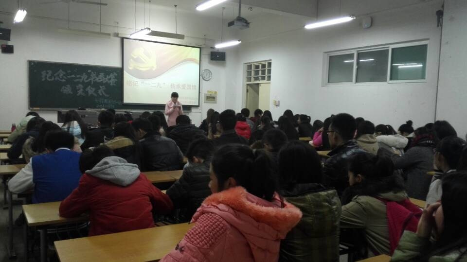 活动在激扬的歌声中拉开帷幕,活动的第一项通过精彩的PPT与爱国宣传视频让同学们了解了“一二九”爱国运动的背景及发展过程,并深刻体会青年学子的爱国情怀。随后我们欣赏了优秀的书画作品,聆听了三位优秀作品获奖者洪赵骏,苏婷婷等同学对“一二九”爱国情怀的认识与感悟。最后,由党员忽鹏程、郭雨、贾瑞等同志为获奖者颁奖。