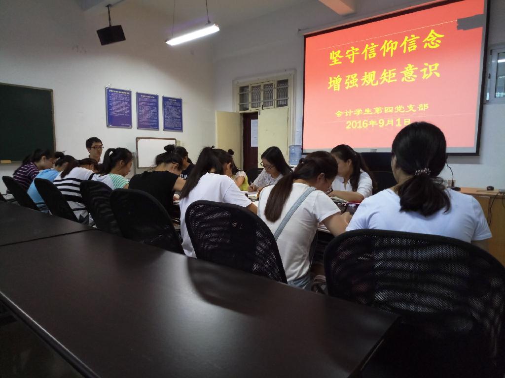 会计学生第四党支部在教5-502召开了以“坚守信仰信念 增强规矩意识”为主题的研讨会。会计学生第四党支部全体党员参加此次专题研讨。支部书记刘雷波主持研讨会。