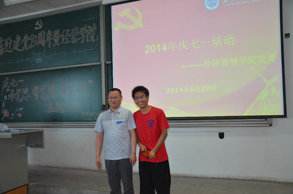 活动伊始,由陈燕老师致欢迎辞,对各位领导和老师、同学的到来表示热烈欢迎。大会第一项由党委委员易亮同志领誓,新党员宣誓老党员重温誓词。第二项由程书记宣读获得校级、院级优秀党员的名单,组织部长刘正利为张晓棠、王育晓、易亮等院优秀党员颁奖。随后,由曲书记致辞,她充分肯定了学院多年来取得的显著工作成绩,同时也提出了对学院党委建设的建议和希冀。接着分别由教师代表史璇老师汇报了其所在的工作组的工作情况,并且表达了其作为一名共产党员应有的奉献精神;毕业班学生党员王雪梅代表2014级毕业生发出了“今日安全离校、明日廉洁从政”的倡议。最后举行了学生支部迎七一“学党史、增党性、送党恩、跟党走”演讲比赛,热情洋溢、激情澎湃的演讲将活动推向高潮。经济学生支部最终获得一等奖,会计学生第一和第三党支部获得二等奖,其他支部获得三等奖。纪委副书记梁闪慧、副院长宋元梁,院党委组织委员为他们颁奖并合影留念。