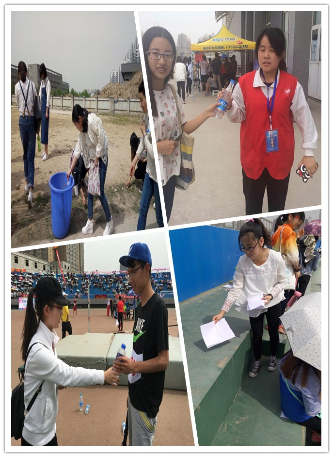 运动会期间,党课学员被分为十四个小组,每个小组独立进行志愿活动,志愿活动具体主题为“服务身边每一个角落”,使小组成员都积极去发现身边的志愿活动,并积极去实践。其中包括:给赛后的运动员及时送去矿泉水补充体内流失的水分,传达对运动员的敬意;帮助受伤运动员进行简单处理和陪护;在运动会结束后,主动地捡拾地上的果皮纸屑,保持操场和看台的干净整洁;对运动会的清洁人员以及为运动会中默默无闻,无私奉献的志愿者送上矿泉水等,志愿者们的身影穿梭于运动会的每一处。