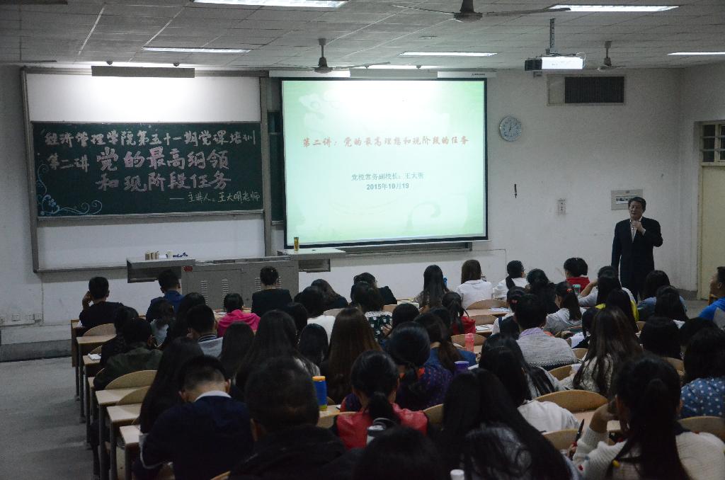 第五十一期党课培训在教1-102拉开了序幕。主讲人党校常务副校长王大明老师就党的最高理想和现阶段任务对各级有入党意愿的同学进行了指导与培训。