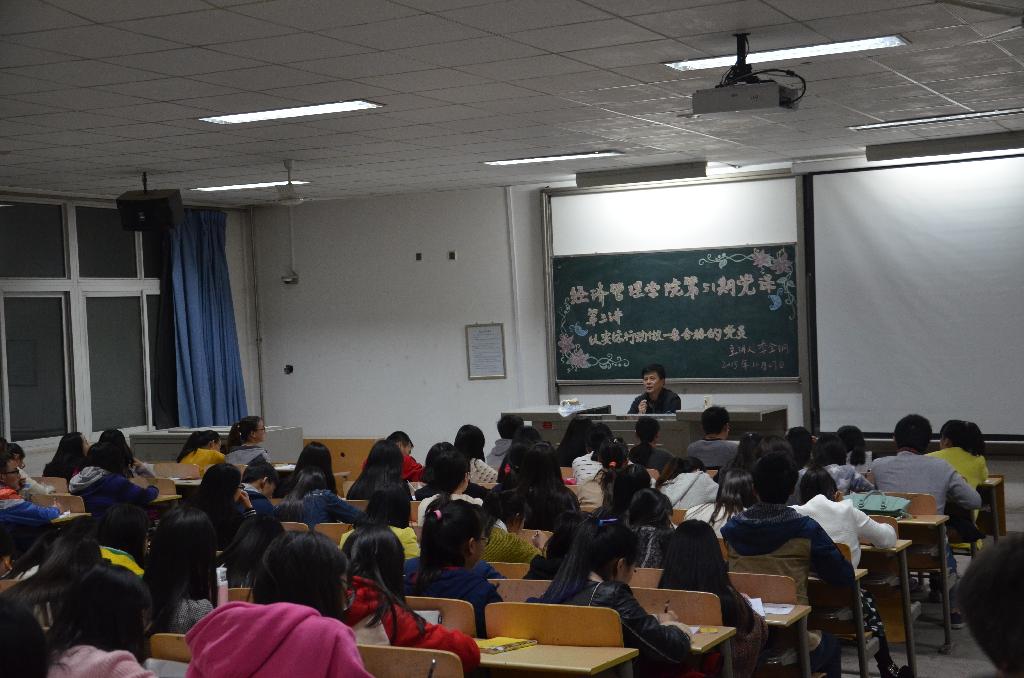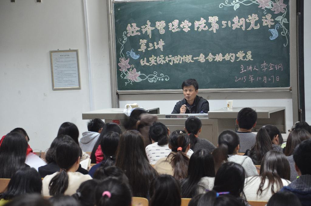 李金钢老师在正式上课前,深情而感慨的回忆了学校历史,讲述了学校从1955年建校以来学业发展、新校区的建设、女篮的征程等值得称赞的事迹,全体党课成员无不为之动容。随后,李老师从书本为基础出发,为学员们讲解了“以实际行动做一名合格党员”这一部分的内容。首先,李老师要求学员们要树立正确的入党动机,并且结合实际深刻地讲述了入党的真正意义;其次,他提出自觉接受党组织的培养、教育、考察是成长为合格党员的必经之路,大家对此深有同感,并且牢固的树立了了入党的积极态度;再次,李老师强调了认真履行党章上规定的入党手续的重要性;最后,李老师指出只有努力实践“三个代表”重要思想,认真学习党章,对党忠诚、热情,才能做一名新世纪合格的共产党员。李老师的讲解,不仅将 “三个代表”重要思想的精髓传播给了在场的每一位学员,更是让在场的各位同学树立了与党共发展的先进观念。讲课过程中高潮迭起,掌声不断。