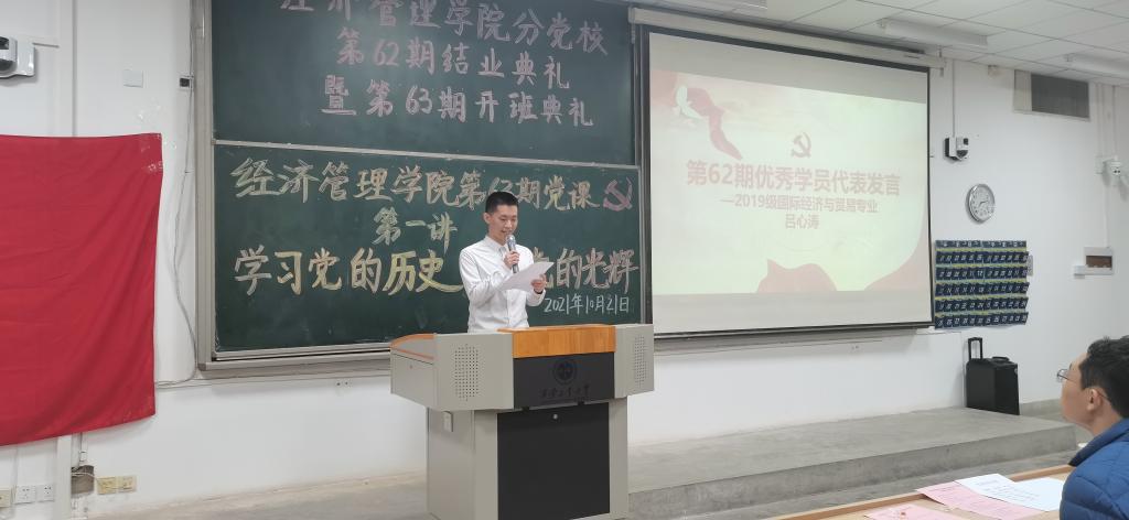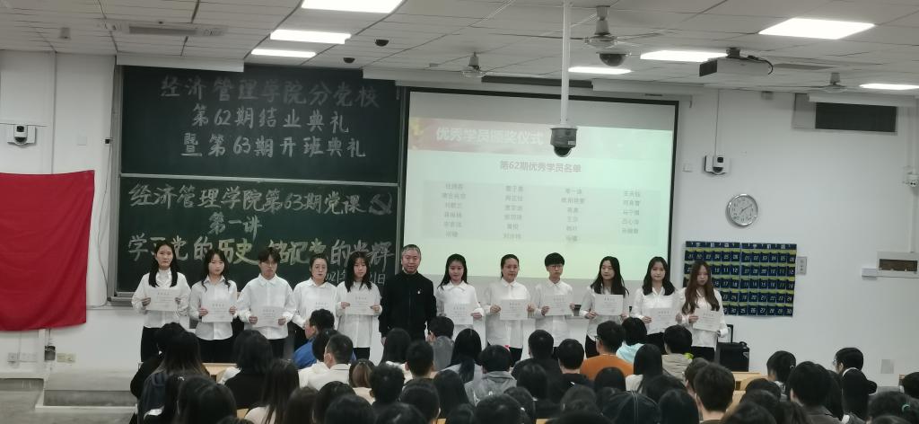分党校第62期党课结业典礼暨第63期党课开课典礼于教1-204成功举办。校团委书记王守民、院党委书记姬浩、各学生党支部书记、第62期优秀学员代表及第63期党课全体学员参加了此次活动。