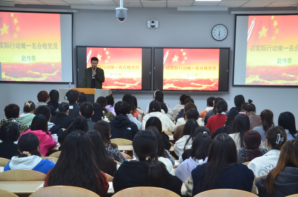 本次授课,赵伟奇老师围绕“放飞青春梦想,争做合格党员”主题,分别对树立正确的入党动机、自觉接受组织的培养、教育和考察、严格遵守入党程序以及以实际行动争做合格党员这四个内容进行深刻的讲解。首先,赵伟奇阐述了入党动机的定义、对为什么要谈入党动机,以及常见的入党动机有哪些等一系列问题做出了一一回应。其次,赵伟奇表明自觉接受党组织的考察就是需要定期递交思想汇报。赵伟奇还介绍了入党的基本程序和流程,这是一个严谨而又漫长的过程。最后,赵伟奇说明了作为一名合格党员自身所应具备的优秀品质与政治素养,倡导我们以实际行动争做合格党员。