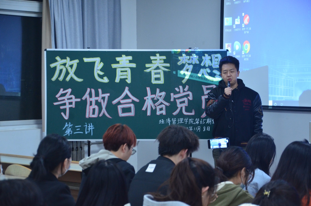 第65期分党校第三讲“放飞青春梦想,争做合格党员”于教2-203教室顺利开讲。本节党课由学校党委组织部老师赵伟奇为学员们展开授课指导,党校140余名学员参加。