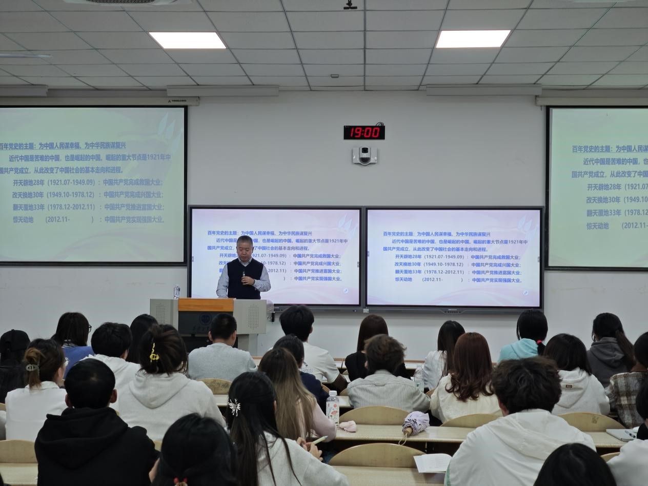 王守民老师从1921年中国共产党成立,改变中国社会的基本走向和进程,讲到开天辟地的28年,党在一步步走向成熟中带领人民完成救国大业;接着讲到改天换地的30年,党在全国执政和全面建设社会主义的时期完成兴国大业,奠定了党在全国执政之“基”,社会主义政治制度之“基”,中国大国地位之“基”,国家经济基础之“基”,社会主义建设的人才队伍之“基”;随后讲到翻天覆地的33年,党在改革开放和社会主义现代化建设新时期实行改革开放的历史性决策,开辟发展中国特色社会主义,完成了富国大业;最后王守民老师讲到惊天动地的11年,党实现了强国大业,也是中国特色社会主义新时代,全国建成小康社会,实现了从站起来、富起来到强起来的伟大飞跃,同时也面临着时代课题的巨大挑战,需要青年积极进取,为党的发展,国家建设,人民福祉奉献青春力量。