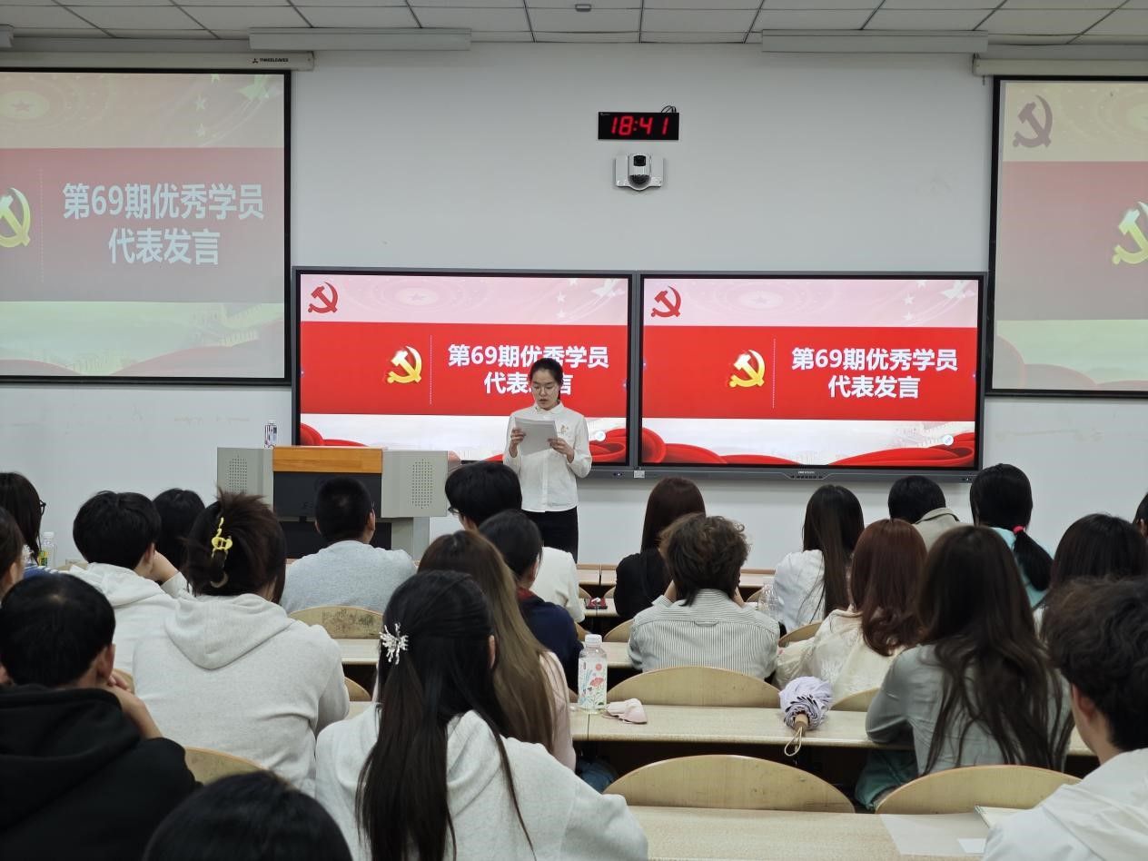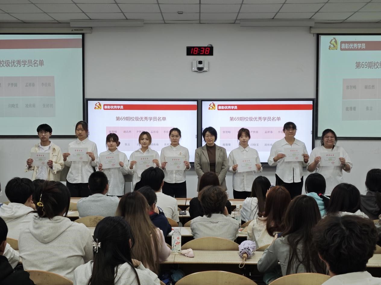 紧接着,主持人宣读了第69期党课优秀学员名单,并进行颁奖仪式,由曲峡老师为校级优秀学员和院级优秀学员分别颁发荣誉证书,并邀请第69期优秀学员代表张言进行发言。她表示在过去的党课学习中进一步了解了党的探索征程与光辉历史,将以更加坚定的决心与信心踏上接下来的学习生活,同时她也对新一期加入党课学习的同学给予了支持和鼓励。