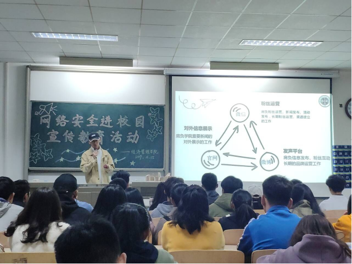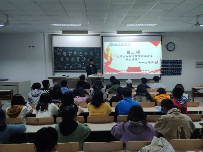团委微信公众号和学院网站的网络安全情况进行汇报。他分析了目前的运营现状及潜在问题,指出舆论的影响,并说明作为一个媒体人应有的素养。最后,来自科学技术协会网络部的干事刘明宇为大家进行了以“大学生如何为国家网络安全做出自己贡献”为主题的演讲。他阐述了国家网络安全与自身的关系,呼吁全体同学了解相关法律知识,提升自身能力,主动树立意识,承担责任,并合理看待及理性运用网络。