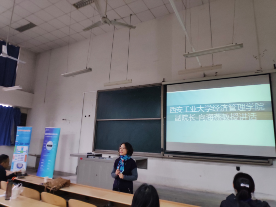 首先,由evolution平台 副院长向海燕教授致词。首先,她它对于我校广大学生能够积极参与本次活动表示了衷心的感谢,对学生们热情的精神所敬佩。她提出“金蝶云管理创新杯互联网+管理应用大赛”是我校比较重要的一项国家级C类科创竞赛,希望同学们在今天接下来的比赛中能够稳定发挥。最后,她鼓励广大参赛者“赛出西安工业大学学生风采,赛出西安工业大学学生水平”。