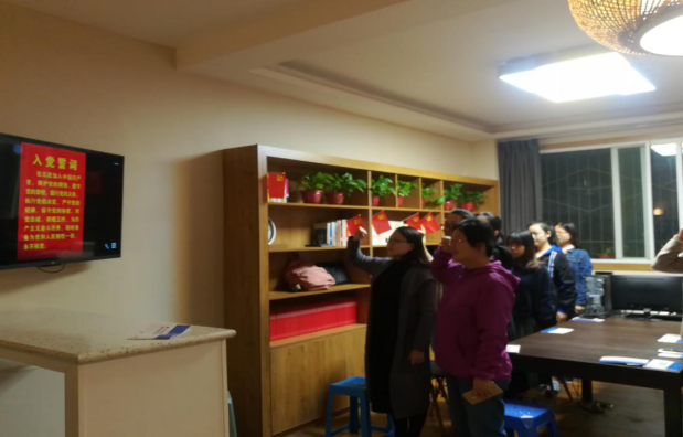 随后,全体党员在支部书记的带领下,大家队列整齐,举起右手庄严宣誓了入党誓词。同志们高亢而又洪亮的声音在研习社久久回荡。