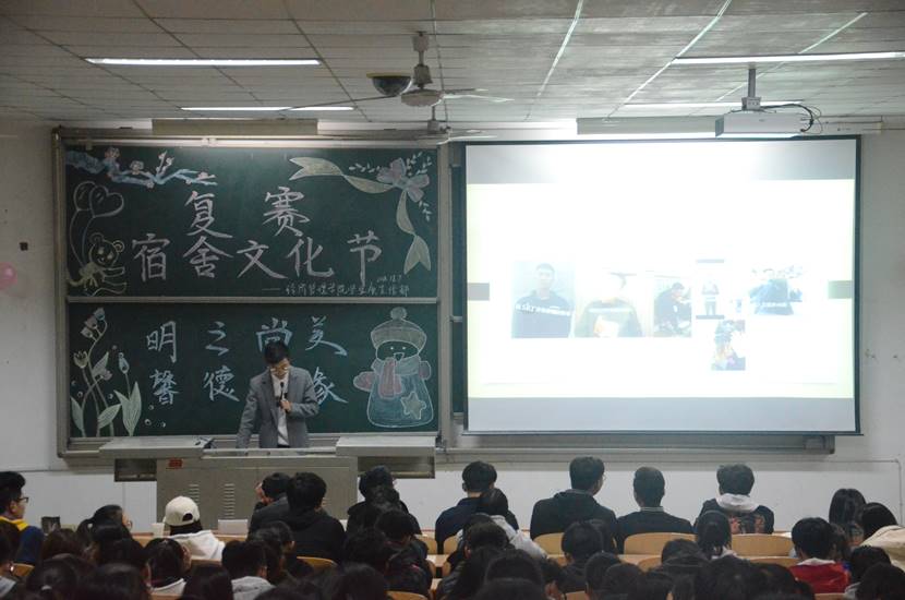 奚小玉担任本次比赛的主持人。“明之尚美,馨德亦缘”宿舍文化节大赛以“文艺双全,寝密无间”为主题。首先,主持人介绍本次比赛的赛制以及比赛规则。紧接着,各宿舍依次派出一名代表讲解宿舍情况PPT并播放录制好宿舍全员短视频,向观众展示自己宿舍。最后,各院学生会主席根据PPT所展示内容,报名宿舍类型契合度,以及介绍人临场发挥等多方面对参赛宿舍进行综合公正地评分。
