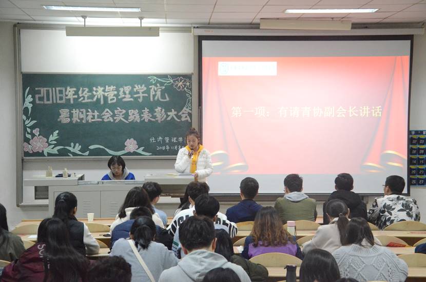 于11月8日下午7点在教2-212召开2018年暑期社会实践表彰大会。出席本次大会的有学院团委副书记刘雷波老师,团委副书记王海睿,2015-2018级部分同学以及社会实践优秀团队代表参加了本次表彰大会。