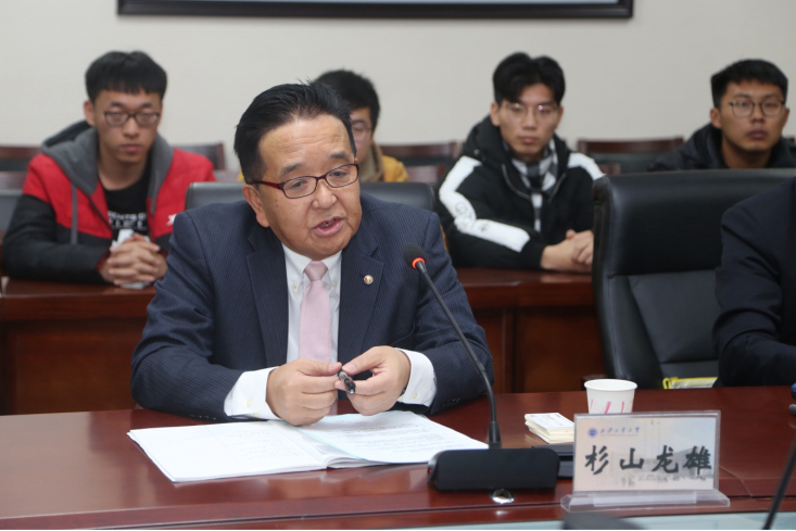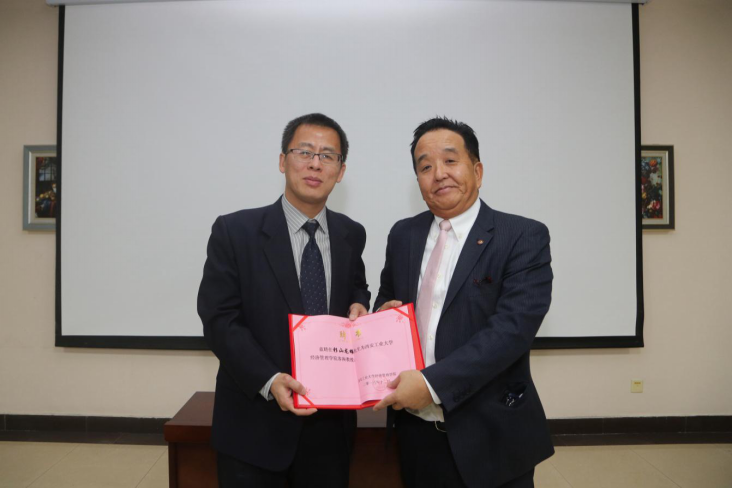 客座教授的聘书。杉山龙雄先生表达了谢意并表示双方将紧密合作,共谋发展,实现互利共赢,欢迎我校的学生到日通公司实习。