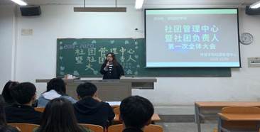 社团管理中心在教3-207召开本学年社团负责人全体大会暨第一次培训会。参加本次会议的有社团管理中心主席杨文霞、各部门部长、各社团负责人及新干事。本次大会由理事部徐海鹏主持。