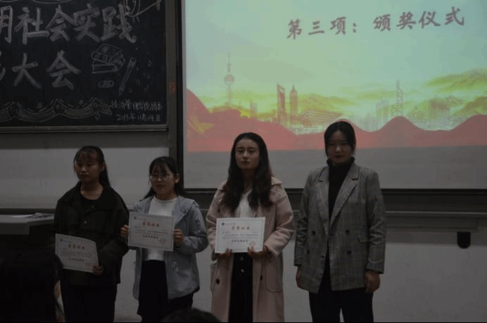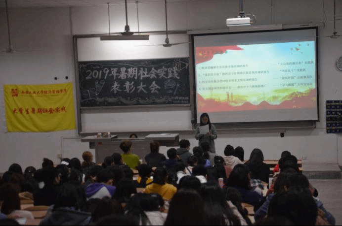 大会伊始,青协部长李素馨对本次社会实践进行总结报告,加深了同学们对社会实践活动的认识与理解。随后,由团委副书记马思聪学姐宣读表彰决定,本次大会重点表彰了院级社会实践优秀团队及个人。并由许金鑫老师和主席团为优秀团体和个人进行了颁奖,对他们的实践精神予以肯定。之后,社会实践优秀团队队长吴依阳、社会实践先进个人代表张晨卓进行了发言。接着大会进行了社会实践优秀DV展示,优秀的摄影作品带同学们领略了社会实践的精神风貌,为大家树立了榜样。大会最后,由许金鑫老师做了社会实践活动的总结,对获奖的个人和团队予以肯定,希望经济管理学院社会实践活动愈加丰富,希望更多的同学积极、认真地参与到暑期社会实践中,书写自己的实践故事。