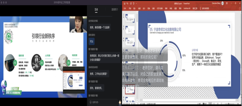 给予毕业生精准有力的就业支持,更好地拓宽毕业生就业渠道,经济管理学院128日下午在钉钉直播举办职等你来,逐梦与共为主题的专场招聘会。参与本次招聘会的有中国水电建设集团十五工程局有限公司、深圳慧通商务有限公司、链家、优优财税服务有限公司、宁波奇邻文化创意有限公司和乐读等6家优秀企业。本次会议由毕业班辅导员王倩倩主持,320毕业生参加。
