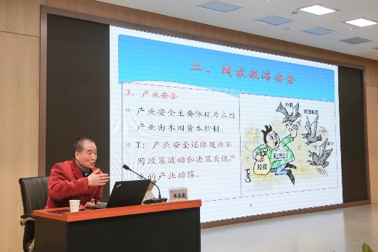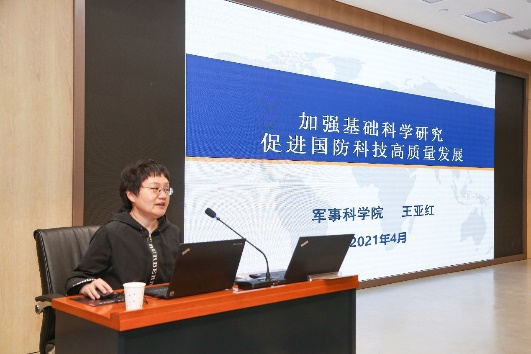 党委书记、院长苏兵主持。解放军勤务学院吴少华教授、南京航空航天大学谭清美教授、军事科学院王亚红研究员和我校王育晓教授分别以《军民融合深度发展中的长效激励机制问题》、《国家经济安全与全球化产业体系》、《加强基础科学研究促进国防科技高质量发展》、《军民科技融合网络创新催化探讨》为主题作了精彩纷呈学术报告。