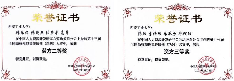 第十三届全国高校模拟集体协商(谈判)大赛由中国人力资源开发研究会劳动关系分会主办,北京物资学院商学院承办。大赛基于理论联系实际及多学科交叉融合的教学理念,搭建校际人才培养机制与模式交流的平台。我校参赛队伍获国家级劳方二等奖、资方三等奖,并且有三名学生获得优秀谈判员一等奖。