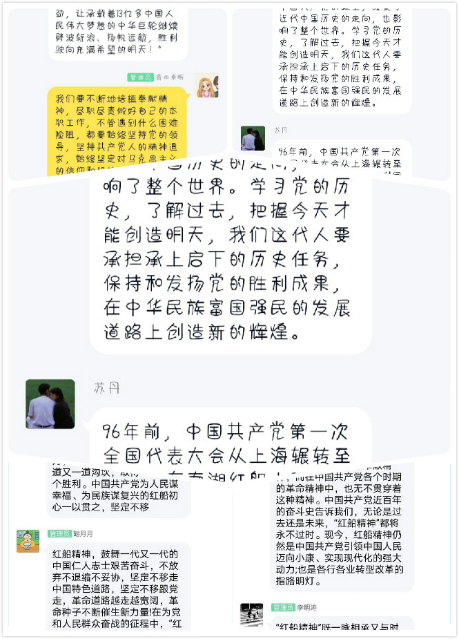 萧瑟秋风今又是,换了人间。从红船到巨轮的人间蜕变,是我们迈向下一个纪元的新起点。青年学生有正确的价值取向和良好的精神追求,中国共产党才会有更优秀的后备力量。学习红船精神并不能只停留在口号和脑海中,全体同学都应脚踏实地得把每一步迈好,用实际行动去践行自己对党的祝福对国家的祝福!