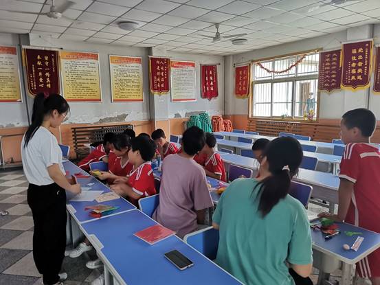 据机构人员介绍,这里的孩子都是父母正在接受改造,没有人照顾,童年缺乏父爱和母爱,比较顽皮。通过教他们折纸、做手工,实践队发现孩子们的创造能力和动手能力很强,做出来的手工多姿多彩,孩子们由刚开始的内向逐渐变得开朗起来,向实践队介绍了平时的生活并且述说了自己在学习和生活中遇到的问题,实践队由此展开了心理健康讲座和心理咨询,与此同时,实践队对孩子们的学习也展开了一对一辅导。在接下来的拔河比赛中,孩子们体会到了团队合作的重要性,操场里充满了欢声笑语。