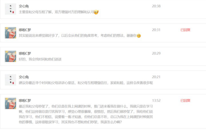 在实践过程中,实践队公众号“交心角”不断地收到来自不同城市中小学生的留言,如“自身自制力不足总在上网课时分心、与家长产生矛盾不知如何解决”,倾诉方面众多,实践队也通过这些留言了解到中小学生网课期间的问题和真实感受。实践队根据了解到的有关心理辅导的相关知识,结合自己的亲身经历和以往积累的经验,对留言的中小学生进行心理辅导,帮助他们克服在网课期间学习生活方面的心理问题,改善和家长之间的矛盾。