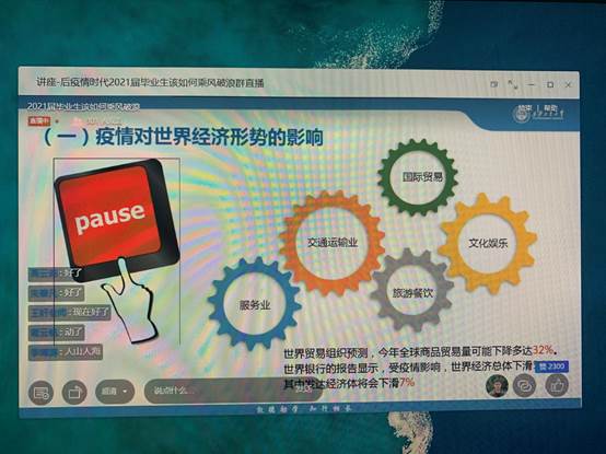 此次讲座付老师从就业形势分析、后疫情时代的就业新常态、当前我校毕业生就业现状及存在问题和乘风破浪扬帆起航这四个板块为同学们进行了就业指导,深入解答了毕业生们的疑问。期间同学们踊跃提问,积极向老师寻求帮助,充分展现了Evolution游戏试玩