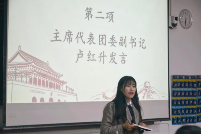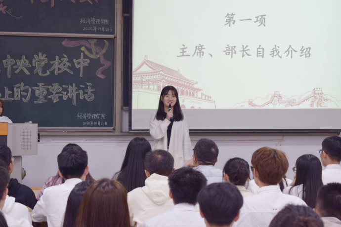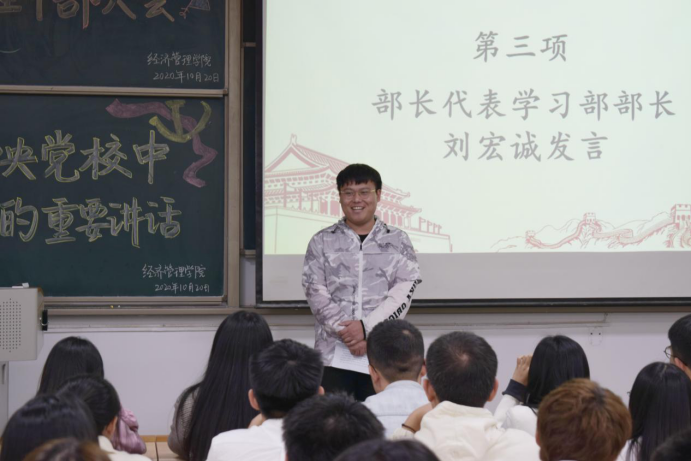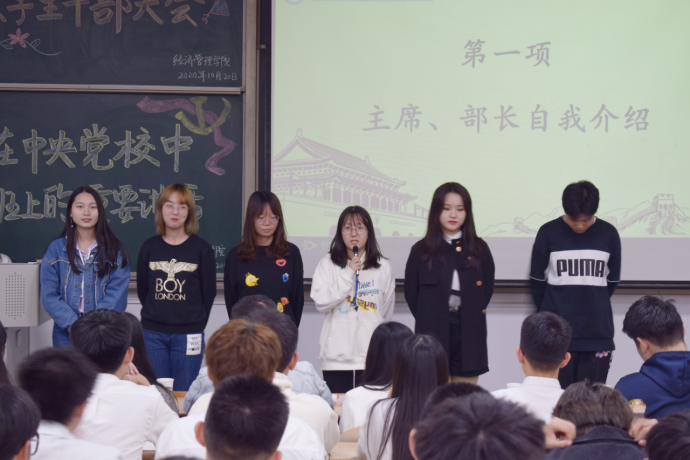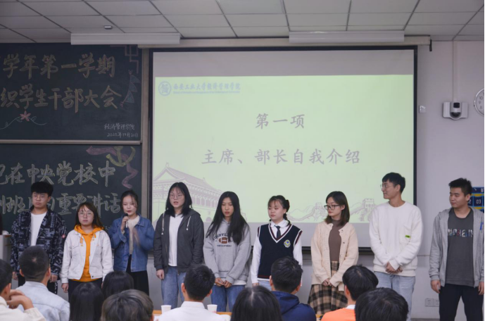 大会伊始,各主席和部长作简要自我介绍。紧接着,学生干部代表发言。主席团代表卢红升表示,作为学生干部,更多的意义在于把自己、部门以及学院的学生工作建设得更好,她将与在座的各位共同努力,成为更优秀的学生干部。部长代表刘宏诚作出承诺,“岁月静好,需得有人负重前行,既然在我们这里开启了新时期,我们就应该且能做好这个先行者,我们必将完成承前启后的责任。”最后,许金鑫对大会进行总结,勉励各学生干部积极响应新学期形势下的政策变化,迎接挑战,不断革新,并对全体学生干部及学院工作给予美好祝愿。