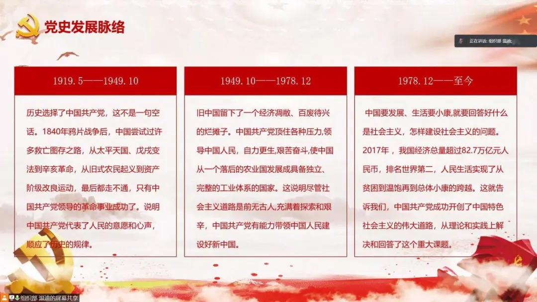 主持人从新民主主义革命时期、社会主义革命和建设时期、改革开放和社会主义现代化建设新时代三个阶段出发,讲述了党曲折而光辉的发展历程。
