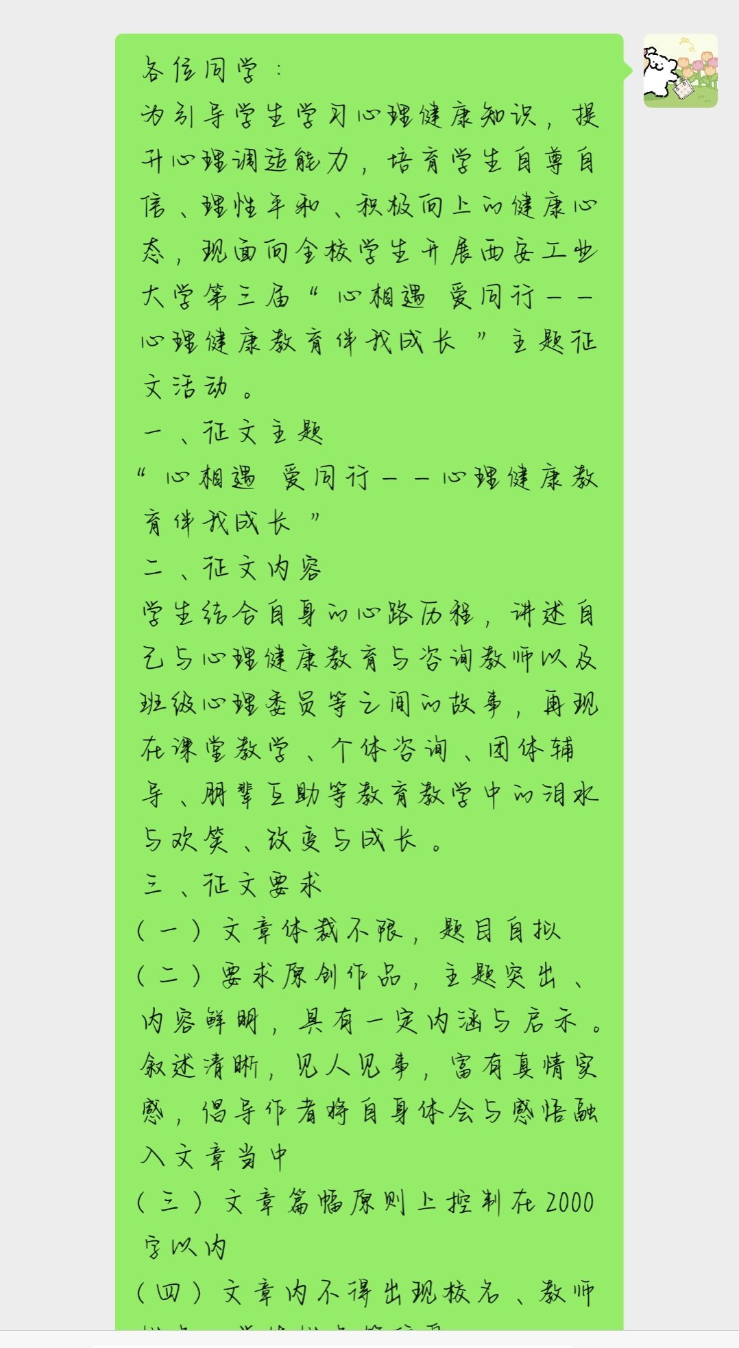 为引导学生学习心理健康知识,提升心理调适能力,培育学生自尊自信、理性平和、积极向上的健康心态,在3月22日至4月1日,面向全校学生开展了西安工业大学第三届“心相遇,爱同行——心理健康教育伴我成长”主题征文活动。活动期间,众多学生积极踊跃地报名参与。