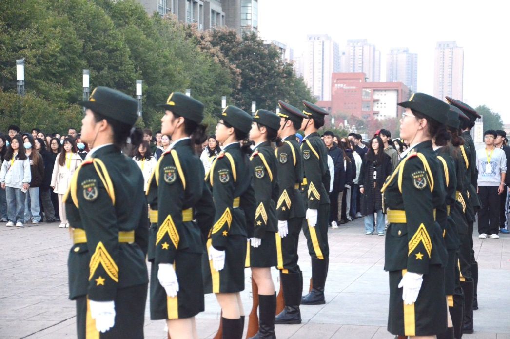 在现场人员的组织安排下,同学们在规定时间集合完毕,等待升旗仪式的进行。清晨七时整,升国旗仪式正式开始。国旗仪仗队的同学们迈着整齐划一、铿锵有力的步伐,护送着五星红旗正步走向旗杆。全体师生面向国旗肃立致礼,目光紧紧跟随国旗,眼神中充满了对祖国的热爱和对国旗的敬仰。