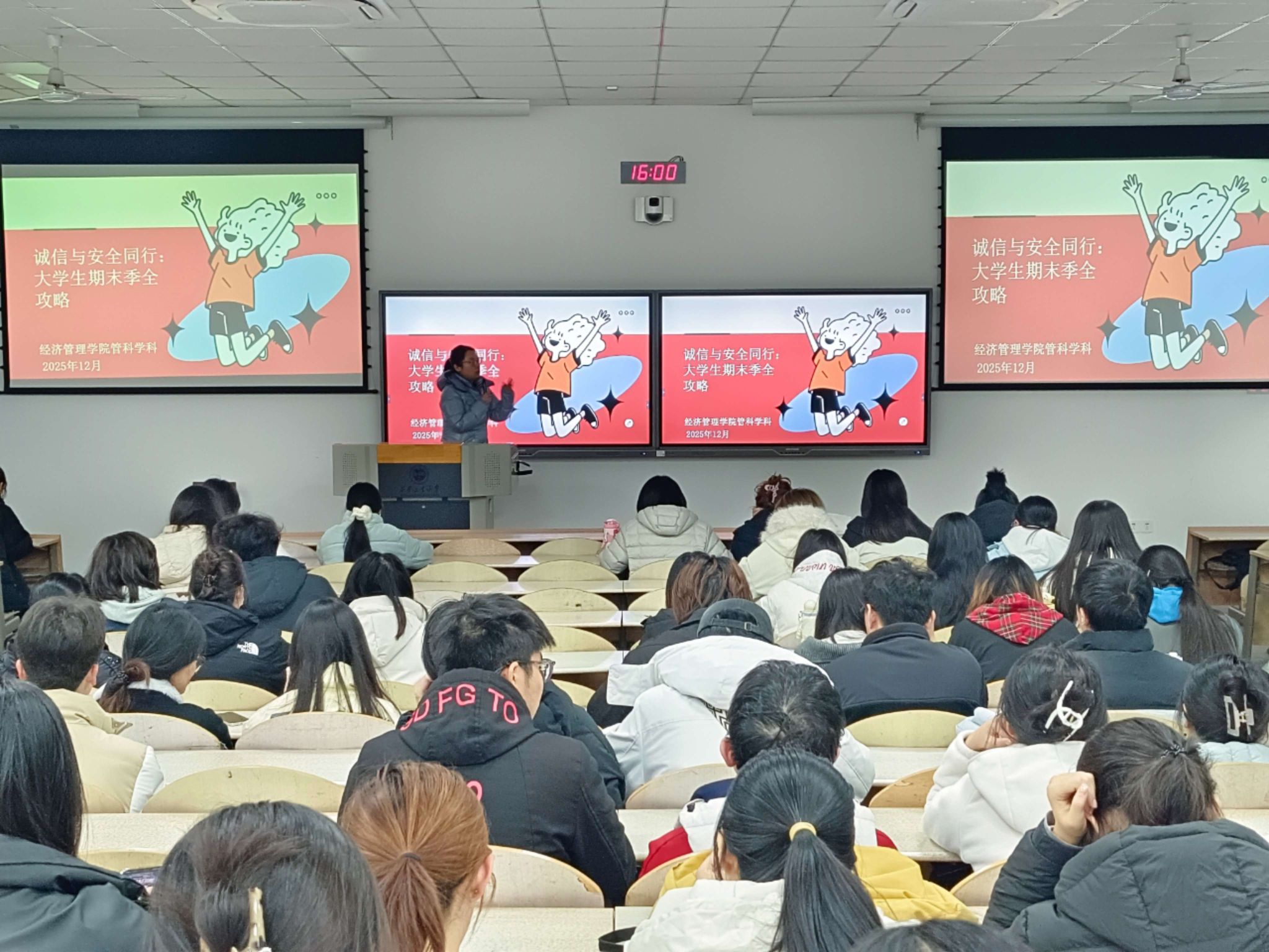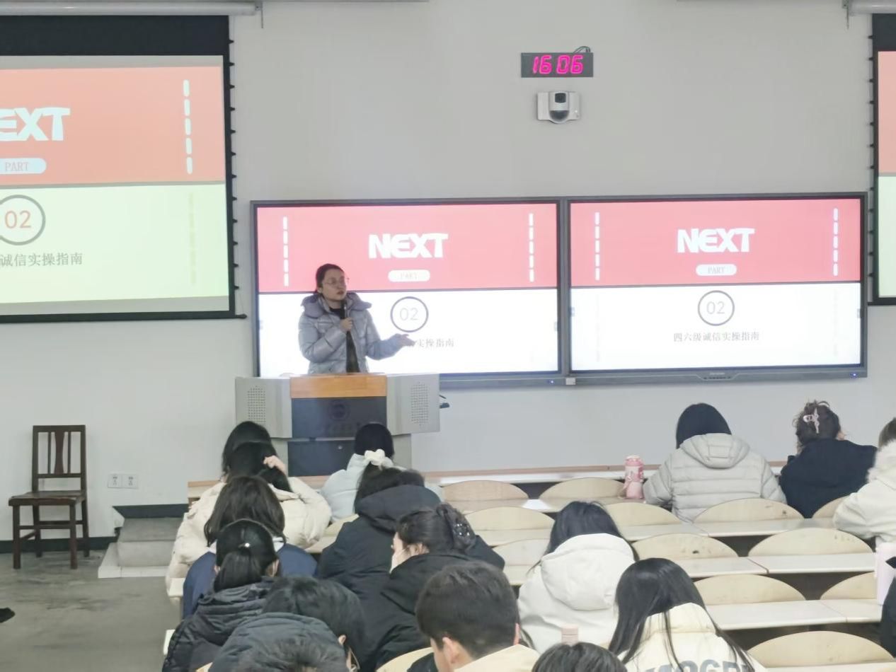 管科学科在教2-104召开 “诚信与安全同行” 期末季主题年级大会,全体学科学生参会。大会围绕考风考纪动员、四六级考试规范、寒假安全防护及责任承诺四大板块,为同学们送上期末季 “全攻略”。